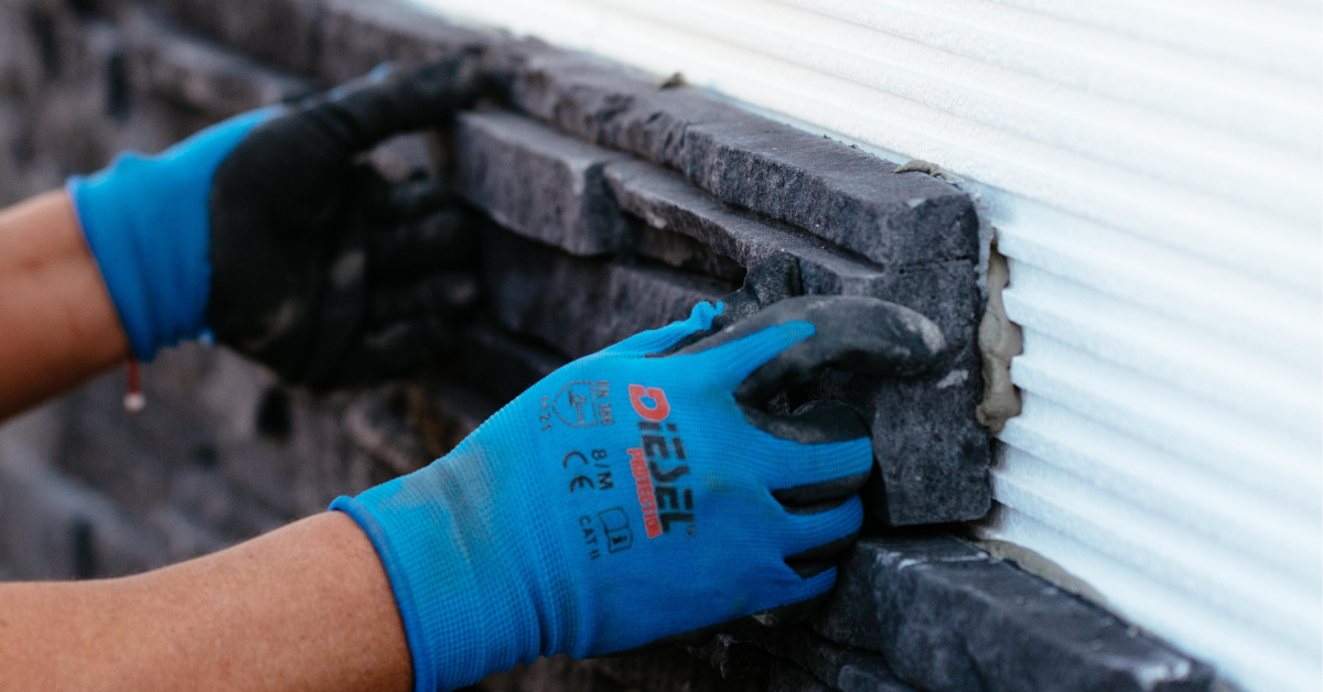 An installer places real stone onto the patented Stone Panel+ continuous insulation system, which uses built-in channels and airflow pathways to speed installation and improve wall performance.